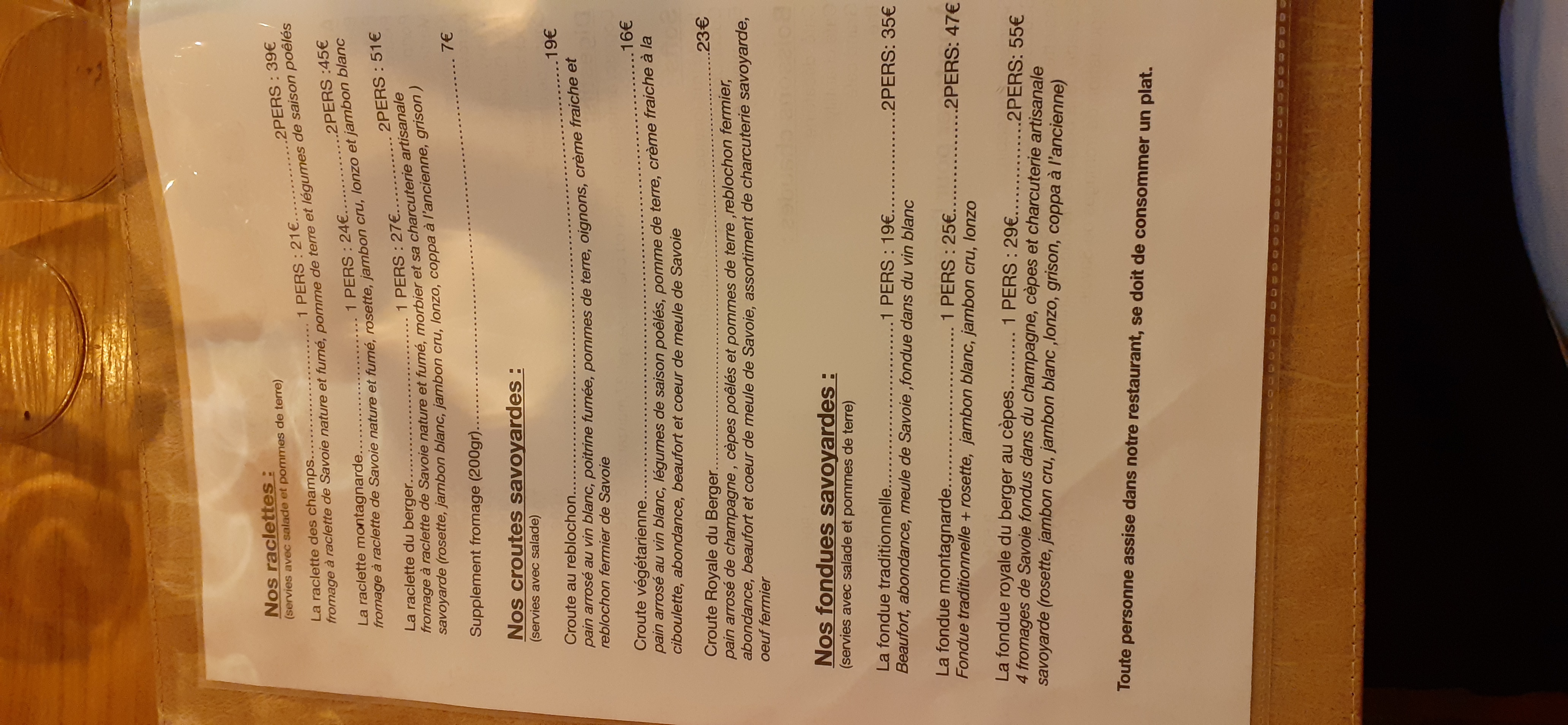 Si déçue du changement de la carte et des nouveaux prix… le menu est désormais obligatoire. Ma tartiflette m’a coûté 36euros, on essaye de te dire que ça vaut le coût grâce à un « amuse bouche » compris dans le menu (pour ce prix la, pas de boisson ni de dessert). Les quantités astronomiques ne rattrape pas, je finis juste avec un sentiment de culpabilité à laisser autant de nourriture dans une assiette. C’est passé d’un restaurant chaleureux où l’on pouvait partager un moment en famille à un restaurant hors de prix attrape touriste… je n’y reviendrai plus :(