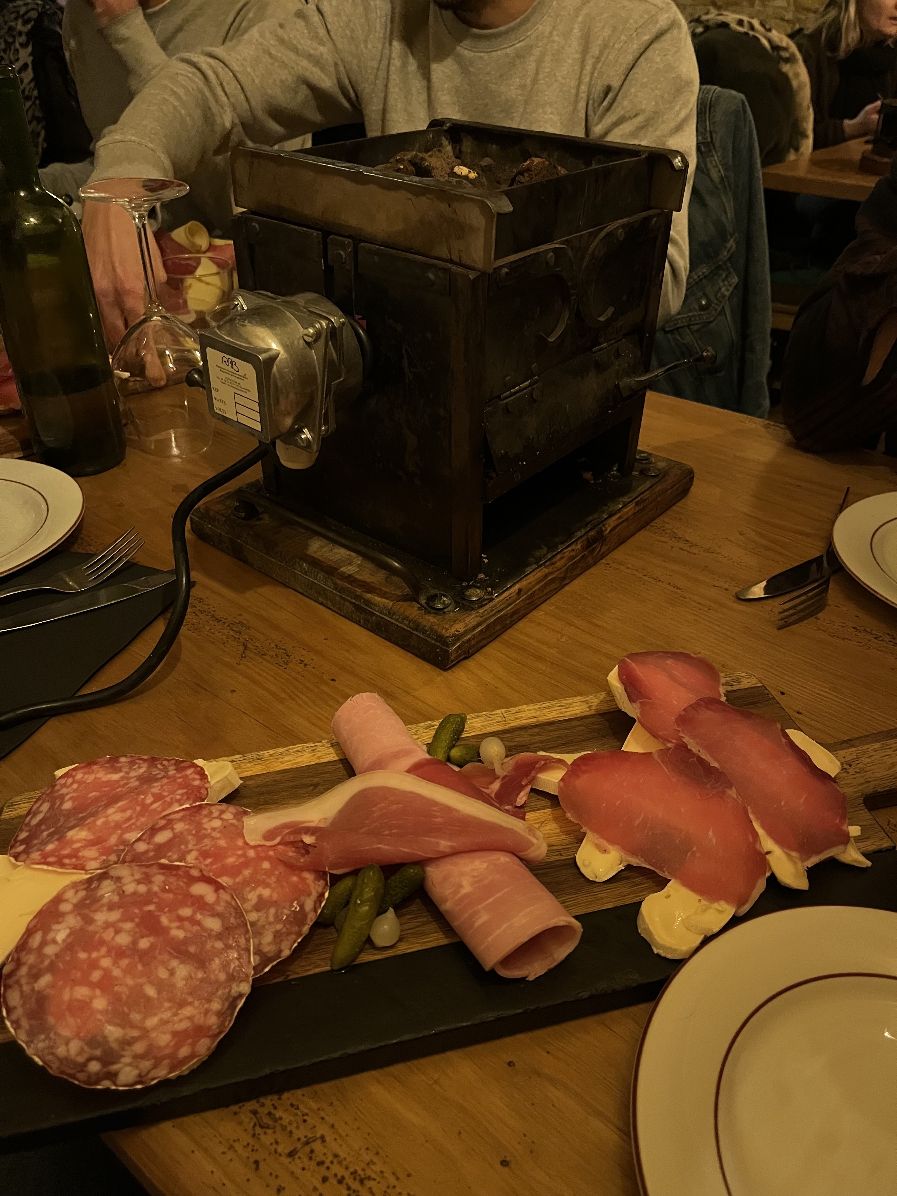 Endroit chaleureux et beaux décors en arrivant on est tout de suite dans l'ambiance raclette fondue au charbon de bois. Plateau de charcuterie bien garnie avec différentes tranches de fromage a faire chauffer avec une petite poêle sous les braises de charbon ardent, petites patates chaudes servies dans un sceau en bois avec petite salade en entrée. Un moment agréablement chaud sous les températures hivernales pour déguster soit une raclette, soit une fondue savoyarde. Personnel agréable vous demandant si tout se passe bien. C'est bon, l'ambiance aussi sous fond de musique pas trop forte. On est bien assis, petit hic avec les plateaux et le matériel de raclette s'ajoutant aux couverts, la table devient vite petite mais ne risque pas de vous faire regretter votre petite soirée restaurant, bien au contraire et vous repartirez le ventre plein. Si vous n'arrivez pas à finir vous pouvez demander de repartir avec ce qu'il vous reste. Possibilité de réserver pour être sûr d'avoir une place à l'heure souhaitée pour vous et votre conjointe, pas besoin de plus pour une soirée romantique ou un bon moment convivial à passer avec votre groupe d'amis. Les produits sont de qualités, le service aussi. D'ailleurs le jour ou soir de grande affluence, si vous n'avez pas réservé, vous serez passible d'attente ou de réserver quand même devant la porte si c'est complet pour repasser à l'heure qu'on vous aura donné. Je recommande car le cadre vous ravira et vous ne regretterez pas le passage dans cet établissement.
